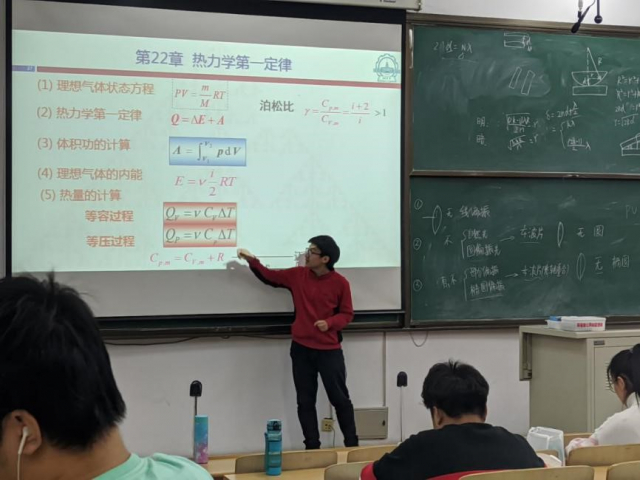 本次讲座首先由程鹏同学进行光学部分的知识点梳理,围绕几何光学、光的干涉、光的衍射、光的偏振四个模块,细致地剖析知识要点,引导同学们建立起自己的知识体系,帮助同学们对本次考试的总体范围、重点难点等都有了更加深刻的了解,使得同学们的复习变得更有目的性和针对性。随后康舒豪同学带领同学们进行了热力学第一定律的知识梳理,重点剖析了等容、等压、等温、绝热四个热力学过程的公式,重点突出,细致严谨,展示出清晰的思路和个人对大学物理知识体系的思考。
